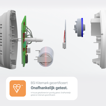 Koolmonoxidemelder met een levensduur van 10 jaar. De geavanceerde elektrochemische sensor is gekalibreerd en getest met CO-gas. Intelligent algoritme verhoogt de gevoeligheid van de sensor bij detectie van lage concentraties koolmonoxide.